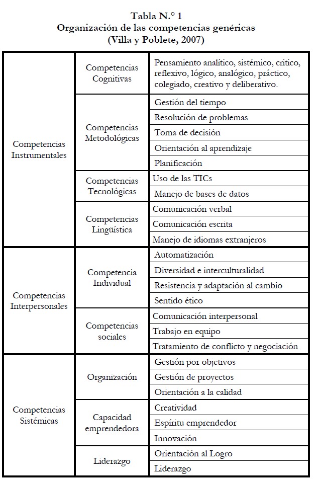 Villa y Poblete (2007) clasifican las competencias en tres grandes tipos o categorías: habilidades instrumentales como son el pensamiento analítico, crítico, reflexivo, lógico, práctico y creativo, habilidades interpersonales como son la comunicación, trabajo en equipo, manejo de conflicto y negociación y las habilidades sistémicas que son la organización, orientación hacia la calidad. Plantean que el incorporar competencias tan variadas hace que el alumno se enriquezca como persona y como profesional.