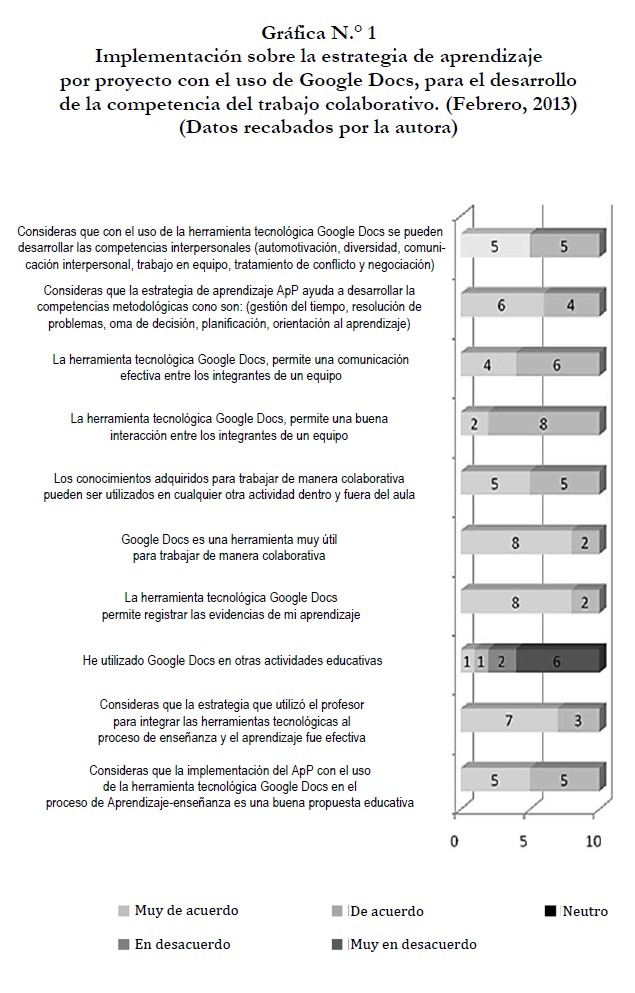 En relación a la incorporación de herramientas tecnológicas para la enseñanza y el aprendizaje, los resultados indican que era la primera vez que los estudiantes utilizaban la herramienta tecnológica Google Docs en actividades educativas dirigidas por el profesor. Los resultados encontrados en esta investigación lo podemos comparar con los resultados encontrados en la investigación realizada por Cenich y Santos (2005) donde realizaron un estudio para describir la experiencia de aprendizaje basado en proyecto colaborativo. Los resultados de esta experiencia resaltan los beneficios de diseñar actividades de proyecto auténtica, desarrollada dentro de un ambiente de aprendizaje que incorpora un conjunto de herramientas para soportar la comunicación online y para trabajar colaborativamente.