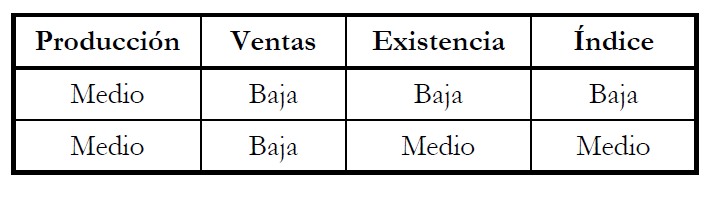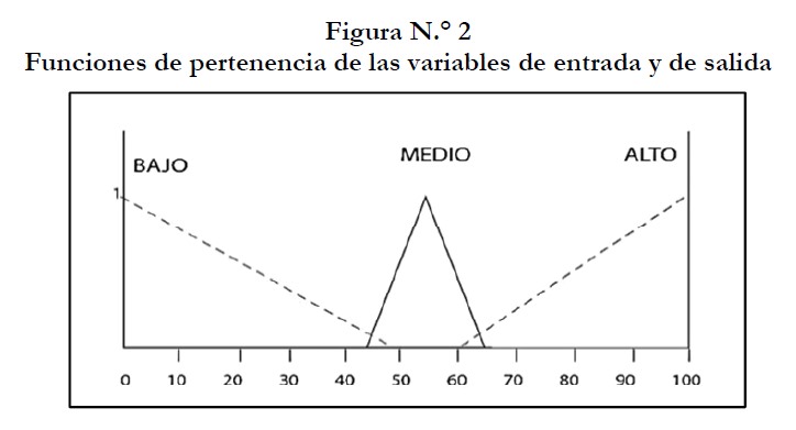 Para la variable de salida en cada uno de los índices utilizaremos los mismos valores lingüísticos bajo, medio y alto con las mismas funciones de pertenencia triangulares utilizadas como variables de entrada.