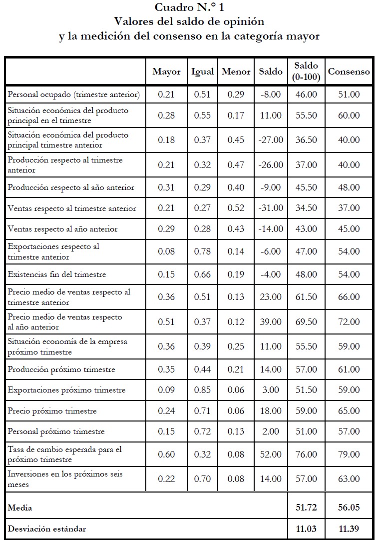 Un primer análisis fue realizado para calcular los saldos de opinión que indican el resultado de un indicador particular y se mide como la diferencia entre la categoría mayor y la categoría menor de una escala tipo Likert de tres categorías. Por ejemplo, a la pregunta de si la producción para el próximo trimestre aumentará, disminuirá o permanecerá igual con una distribución de probabilidad , el saldo de opinión es . Este resultado indica que aquellos que opinaron que la producción será menor para el próximo trimestre excedieron en 14% a aquellos que opinaron que la producción será mayor, y por tanto, esta es la tendencia. El cuadro N.◦ 1 muestra los valores del saldo de opinión y la fuerza del consenso en la categoría mayor para cada una de las variables, además de la media aritmética y la desviación estándar, respectivamente.