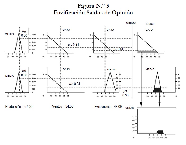 Un primer sistema difuso fue realizado para medir el Índice de Confianza Industrial (ICIN) teniendo como parámetros en las variables de entrada los saldos de opinión. Las variables de entrada fueron la producción en el próximo trimestre, inventarios y ventas en el trimestre anterior. El sistema difuso reportó un Índice de Confianza Industrial de 46.51.1 El Índice reportado por la metodología del promedio de los saldos de opinión2 fue de 47.80. La figura N.◦ 3 muestra las fases del sistema difuso.