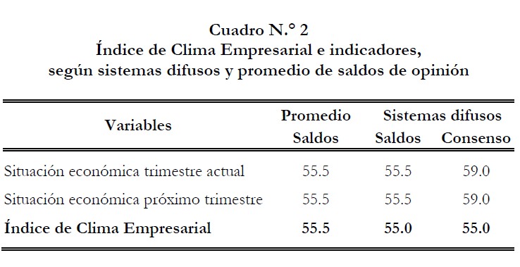 El Índice de Clima Empresarial calculado por los sistemas difusos fue de 55.00 y 55.00, utilizando los saldos de opinión y las medidas de consenso, respectivamente. El Índice calculado en la encuesta como la media geométrica de los saldos de opinión fue de 55.50.
