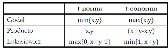 Ejemplos de las t-normas y t-conormas más conocidas que sirven como una interpretación generalizada de la intersección y la unión son: