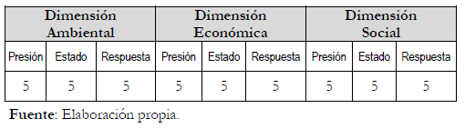 Para la medición del desarrollo sostenible según los índices, se modifican los rangos recomendados por la Dirección de Ordenamiento Territorial del Instituto de Planificación Física (2008), a criterio de las autoras y en consulta con el grupo de trabajo, se decide ampliar los segmentos de la medición con el objetivo de lograr una mejor visualización de las diferencias en los resultados obtenidos. Por tanto los rangos siguen como se enuncian a continuación: