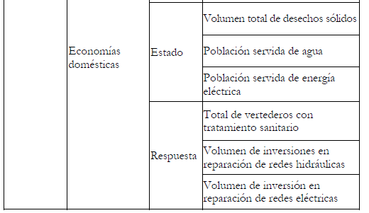 • Indicadores de presión ambiental causadas por el hombre.• Indicadores de las condiciones o calidad del ambiente y los recursos naturales.