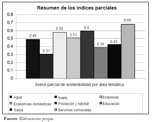 • La medición del desarrollo sostenible en la localidad a través de un sistema de indicadores se realizó mediante 8 índices parciales, uno para cada área temática, con rangos preestablecidos. Estos índices: agua, suelo, empresas, economías domésticas, población y hábitat, educación, salud y servicios comunales mostraron resultados de 0.49, 0.31, 0.58, 0.51, 0.60, 0.39, 0.43 y 0.68 respectivamente, con los que se procedió a construir un índice global que mostró un valor de 0,50, que lo ubica en el rango entre 0,5 y 0,69 que significa que se tiende hacia lo menos sostenible.