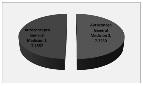 De manera global, las participantes, mujeres que viven con VIH, presentaron un autoconcepto de M = 7.2250, muy parecido al promedio obtenido en la primera medición de M = 7.1557 (Ver gráfico N.º 6).