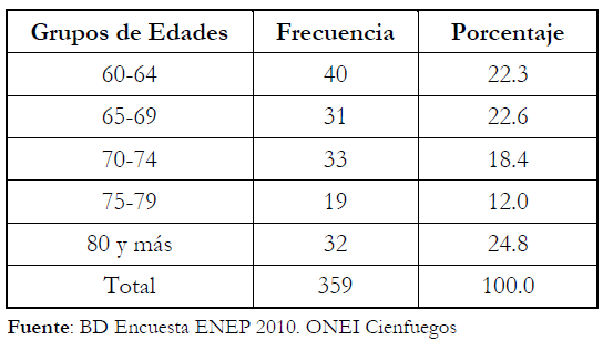 Como se observa en la siguiente tabla, en Cienfuegos de los 359 casos investigados de 60 años y más, se concentra la mayor cantidad de personas de la tercera edad en el grupo de 80 años y más con un 24,8%, seguido del 60-64 años con 22,3% y el de 65-69 años con 22,6%.