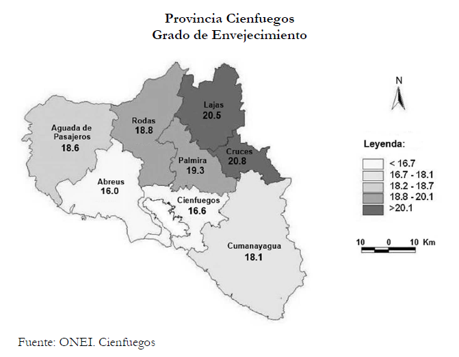 En el mapa anterior se expresa el comportamiento del grado de envejecimiento en la provincia de Cienfuegos; los municipios del norte ocupan los valores más altos, 20,8% en Cruces y 20,5% en Lajas y los más bajos corresponden a los municipios del sur de la provincia, Abreus con el 16,0% y Cienfuegos con 16,6%.
