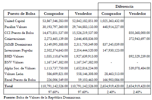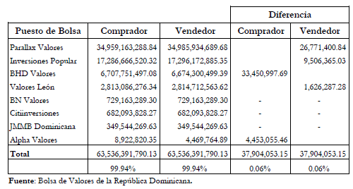 En las tablas 1, 2 y 3 se aprecia que la práctica principal de las negociaciones de títulos de deuda de renta fija en el mercado secundario bursátil dominicano, es que entre el 97% y el 99% del volumen total negociado de títulos de deuda de renta fija que realizan los intermediarios de valores en el mercado secundario bursátil son ejecutadas en ambas puntas por un mismo puesto de bolsa. Esto significa que la gran mayoría de las operaciones fueron calzadas donde el puesto de bolsa comprador y el puesto de bolsa vendedor es el mismo en cada operación.