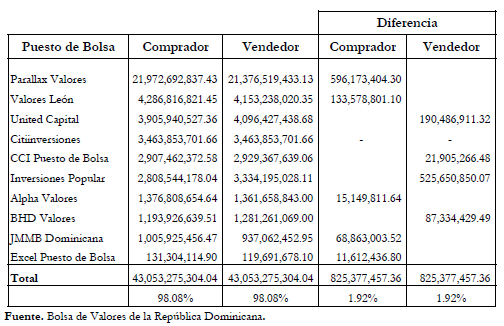 De acuerdo con los puestos de bolsa consultados en el mercado de valores dominicano aún no existe una real liquidez, lo cual explica, según ellos, que en la mayoría de las negociaciones bursátiles el intermediario comprador y el intermediario vendedor es el mismo. Sin embargo, no es posible comprobar que se deben cruzar las operaciones debido a la falta de liquidez del mercado. De igual modo, tampoco es posible comprobar que cuando los intermediarios colocan una orden para dejarla que se ejecute, pasan días sin que ningún otro intermediario les interese.