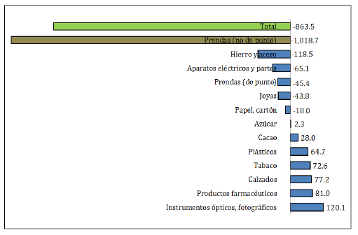 Como se advierte en el gráfico 3, otros capítulos que registraron caídas fueron hierro y acero (72), aparatos eléctricos y sus partes (85), prendas de tejido de punto (61), joyas (71) y artículos de papel y cartón (48). Sin embargo, estas últimas tuvieron un peso mucho menor a las de confecciones no de punto. Mientras, los que experimentaron incrementos fueron, en orden descendente, instrumentos ópticos y fotográficos (capítulo 90), productos farmacéuticos (30), calzados (64), tabaco (24), plásticos (39), cacao (18) y azúcar (17).