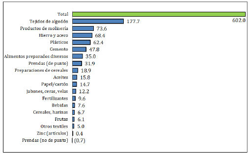 Otros productos destacados por el incremento en el valor nominal de las exportaciones son productos de molinería (en particular harina de trigo), tejidos de algodón, azúcar, cemento, otros productos textiles, bebidas y preparaciones alimenticias.
