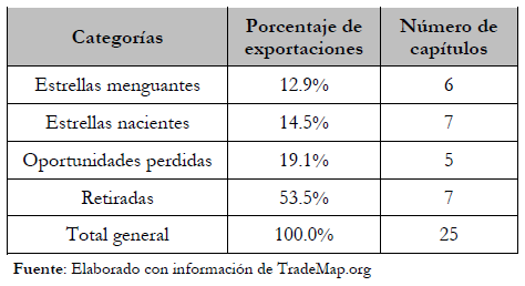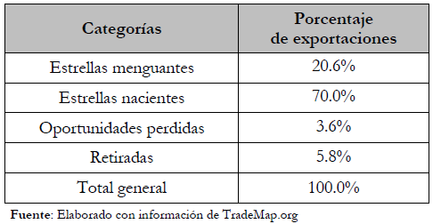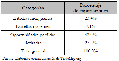 - Oportunidades perdidas: son las que declinaron en su participación en las exportaciones totales pero, en contraste, las exportaciones mundiales vieron incrementar su peso en las exportaciones mundiales totales. Como su nombre lo indica, se trató de una oportunidad no aprovechada.