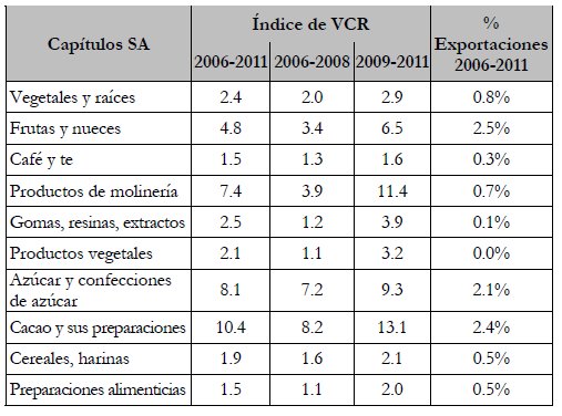 Como se indicó, el ejercicio también se realizó para los subperíodos 2006-2008 y 2009-2011 a fin de identificar cambios en el tiempo. Los cambios positivos más intensos, es decir, donde se advierten un incremento significativo en el índice de VCR fueron en las exportaciones de frutas y nueces, productos de molinería, gomas y resinas, productos vegetales, cacao, comestibles misceláneos y cemento. Los cambios negativos más intensos se advierten en las exportaciones de prendas de vestir no tejidas, joyas y hierro y metales.