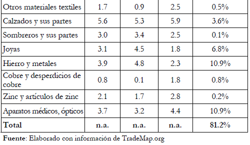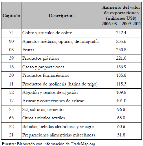 Como se evidencia, se trata de un grupo de productos diversos, los cuales incluyen manufacturas y productos primarios tales como artículos de cobre, aparatos médicos, frutas, productos plásticos y cacao y preparaciones.