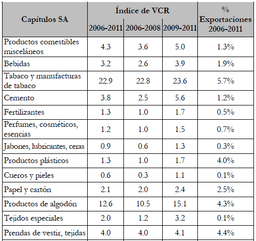 El cuadro 6 ofrece los resultados y considerando la discusión de las secciones anteriores, no aparecen muchas sorpresas. Los productos en los que el país aparece relativamente especializado en el período 2006-2011 (32 capítulos del Sistema Armonizado) son aquellos que tienen un relativamente alto peso en la canasta de exportación. A juzgar por el Índice VCR, República Dominicana está altamente especializada en la exportación de tabaco y manufacturas, tejidos de algodón (vinculadas a las exportaciones de empresas de zonas francas hacia Haití descritas arriba), cacao, prendas de vestir no tejidas (zonas francas), azúcar y productos de molinería. También, aunque en menor medida en calzados (zonas francas), prendas de vestir tejidas (zonas francas), frutas, hierro, cemento (estos dos últimos especialmente hacia Haití) y aparatos médicos, ópticos y fotográficos (zonas francas).