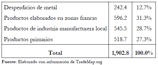 En conjunto, todos los productos con un VCR>1 explicaron el 81.2% de las exportaciones del país en ese período. Las exportaciones de hierro y metales (varillas), aparatos médicos y ópticos (zonas francas) y prendas de vestir no tejidas, fueron las de mayor peso en las exportaciones totales.