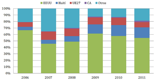 Composición de las exportaciones dominicanas por grandes mercados de destino 2006-2011 (% de exportaciones totales)