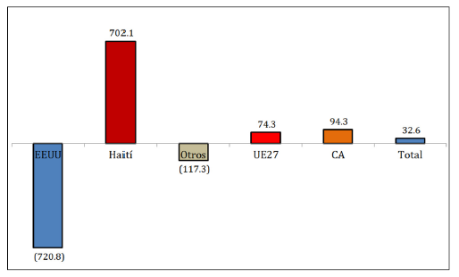 De lo anterior se evidencia que en términos de mercado de destino, la reducción notable de las exportaciones hacia Estados Unidos y el incremento de estas hacia Haití es la novedad en el período. Más aún, una comparación del cambio absoluto en el valor de las exportaciones hacia ambos mercados entre 2006 y 2001 sugiere que la reducción de las exportaciones hacia Estados Unidos fue compensada por un aumento de las exportaciones hacia Haití, evitando una caída significativa del valor total exportado. En efecto, mientras entre 2006 y 2011 las exportaciones hacia Estados Unidos cayeron en poco menos de US$ 721 millones, las dirigidas al mercado haitiano en ese mismo período aumentaron en US$ 702 millones (véase el gráfico 2). El resto de los destinos de exportación apenas vieron modificarse sus valores nominales en ese período.