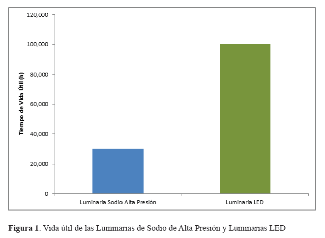 La vida útil de la luminaria es un eje fundamental, mientras que una lámpara de sodio de alta presión comúnmente empleada en iluminación vial tiene una vida útil entre 28,000 y 32,000 horas según datos reportados por Osram y Phillips (Osram a, 2016) (Philips a, 2016), las luminarias LED, según fabricantes y con un buen diseño mecánico del disipador de calor efectivo puede alcanzar una vida útil de 100,000 horas (Phillips b, 2016) (Osram B., 2012) (Figura 1), sin embargo este valor es obtenido bajo condiciones de laboratorio y es resultado de extrapolaciones por lo que en la práctica esta cifra es cada vez “más conservadora” por parte de los fabricantes.