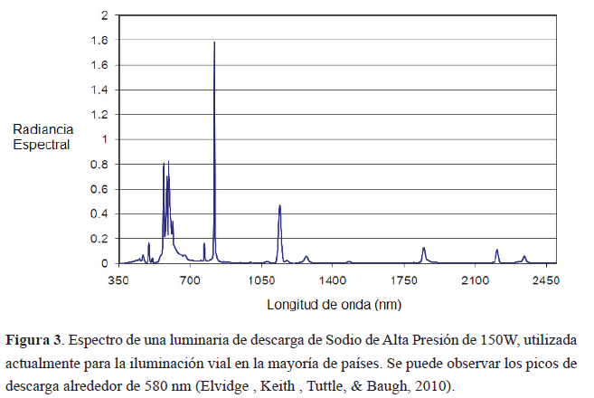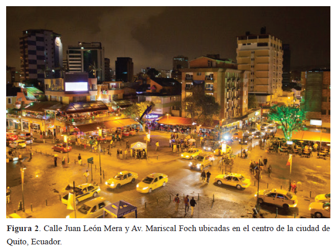 Las lámparas de sodio de alta presión tienen un espectro con dos líneas definidas en 589 nm y 589.6 nm (Flesch, 2006), cerca del pico de máxima sensibilidad de visión del ser humano. Esto provoca que se miren todas las cosas de color amarillento, lo cual es perfectamente aplicable a las tareas elementales de caminar o conducir; sin embargo, existen vías (especialmente en las capitales de comercio como Caracas, Quito, Guayaquil o Cali) en las que se realizan regularmente actividades que necesitan fuentes luminosas con buenas propiedades de reproducción del color: exposiciones artísticas, desfiles estudiantiles, resaltación de fachadas o monumentos, tarimas para presentaciones (en la Figura 2 se muestra un cruce de calles en Quito donde los ciudadanos comúnmente realizan esta clase de actividades). Dos buenas opciones son las lámparas de haluros metálicos y la luz LED, esta última ofrece varios “tipos de blancos” y en su mayoría se utiliza aquellas enriquecidas en los azules.