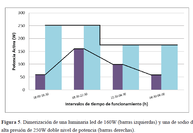 La dimerización permite controlar la energía consumida por la luminaria, el criterio a emplearse puede ser propuesto en función de la hora a la que se encuentre. Las horas pico deberán funcionar utilizando toda su potencia nominal; pero, en la noche avanzada y madrugadas, donde no existe la misma demanda de usuarios se puede reducir la potencia entregada, disminuyendo de esta forma el consumo energético de la ciudad o del país. La definición de los intervalos de tiempo y la potencia necesaria en cada intervalo (un ejemplo propio se muestra en la Figura 5) necesitan un estudio particular que depende de las necesidades de cada ciudad; y puede ser establecido por la empresa encargada de la iluminación vial o exterior.