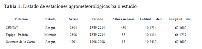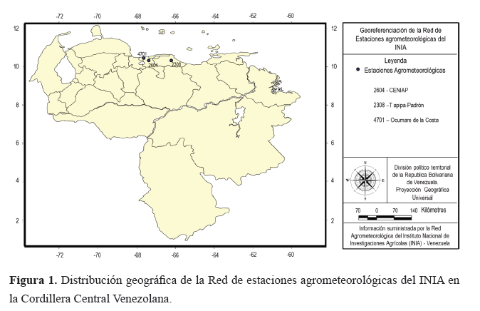 En esta investigación, la unidad de estudio está constituida por tres estaciones: CENIAP, Tapipa Padrón y Ocumare de la Costa, las cuales conforman la red de estaciones agrometeorológicas del INIA, abarcando la región de los Llanos (estados: Aragua y Miranda) (Figura 1).