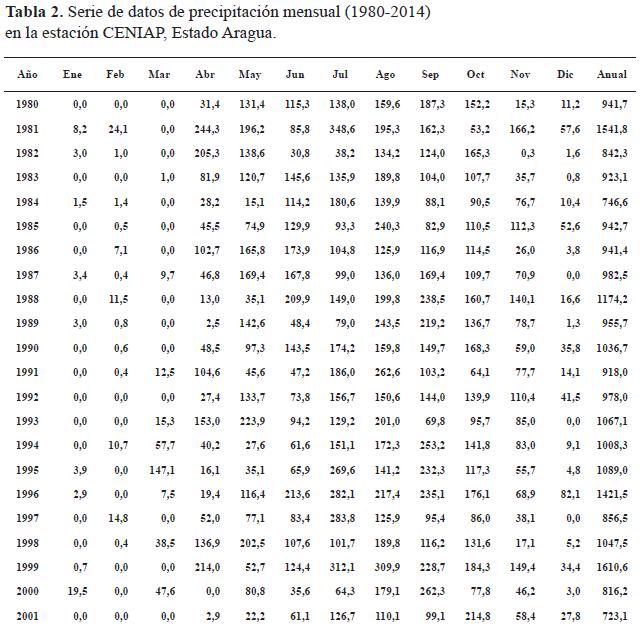La Tabla 1 presenta la información de la metadata básica representada por el serial nacional, el cual es un código asignado por el organismo responsable de la estación meteorológica, nombre de la estación, fecha de instalación, altitud en m.s.n.m, ubicación en grados, minutos y segundos para obtener la georeferenciación (Latitud y Longitud). Es conveniente señalar que el período de años utilizados en este estudio corresponde al indicado desde la fecha de instalación hasta el último año de registro de cada estación agrometeorológica con la finalidad de conocer la variación temporal de los eventos de sequía en el trascurso histórico para esas localidades. La tabla 2 presenta la variabilidad de la precipitación mensual durante el período de estudio en la estación CENIAP.