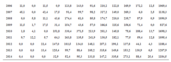 La tabla 3 presenta un resumen de los procedimientos estadísticos aplicados a las series de precipitación mensual, el principal problema característico lo constituyeron los datos faltantes mensuales, lo que afectó la longitud de las series que quieren analizarse. El resto de los procedimientos estadísticos arrojó resultados adecuados dentro de lo esperado.
