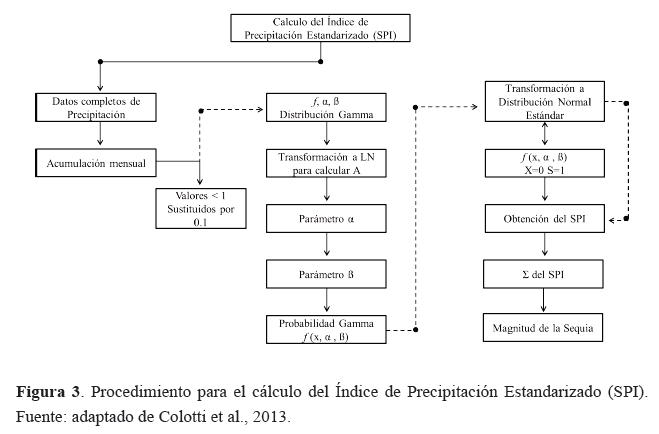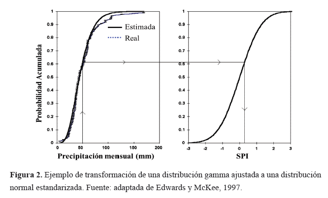 En este trabajo, para la caracterización de la sequía en las áreas bajo estudio, se utilizó el Índice de Precipitación Estandarizado (SPI, Standardized Precipitation Index), desarrollado por Mckee et al. (1993). De modo general, para el cálculo se pueden describir dos etapas: la primera consiste en ajustar distribución teórica Gamma a la serie histórica de la precipitación. La segunda etapa consiste en convertir la serie de precipitación ajustada a la distribución Gamma en una distribución normal estandarizada con media 0 y varianza 1, cuyo resultado representa el índice SPI (Figura 2) (Edwards y Mckee, 1997).