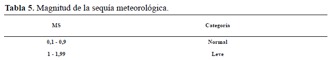 Dónde (MS): representa la magnitud de la sequía para el período evaluado, (SPI): es el índice SPI para series de lluvia acumulada mensual. La tabla 5 muestra las categorías de la magnitud de la sequía.