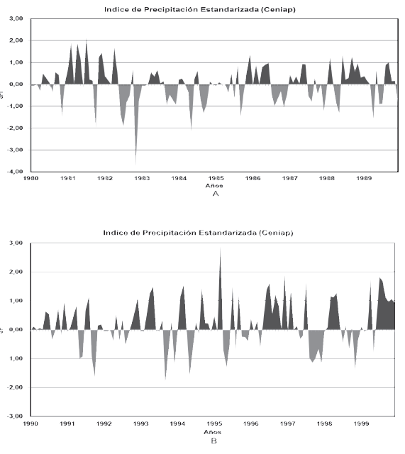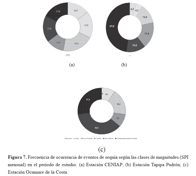 En la estación CENIAP, la mayor magnitud fue de 9,20, ubicándose en dos meses lluviosos del año 1982. También para el año 2001, hubo una disminución en el total anual de lluvia registrada en la zona asociada al evento de sequía durante dos meses del pre húmedo y dos meses del periodo lluvioso. Este mismo comportamiento se presentó en la estación Tapipa-Padrón para ese mismo año asociado a la sequía de magnitud 9,70 y de tres meses consecutivos de duración.