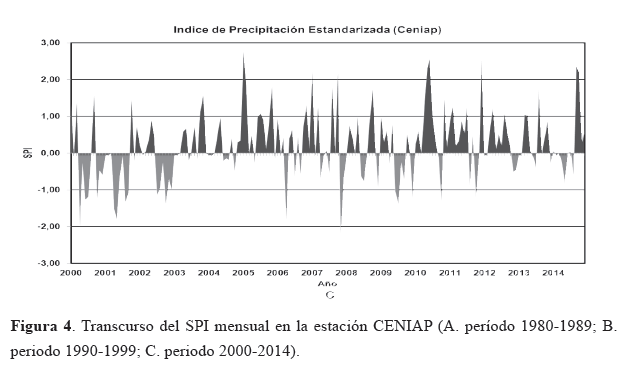 La figura 4 muestra la intensidad de la sequía de todo el período de registro en la estación CENIAP. De acuerdo con los registros de lluvia de la estación se presentaron valores de sequía extrema (SPI –2 o menos) que representan el 1,89%, mientras que la intensidad severa (SPI entre–1,99 a –1,5) alcanzó el 2,27%. La Intensidad predominante es la moderada (SPI entre –1,49 a –1) constituida por 6,82% del total de SPI mensuales evaluados.
