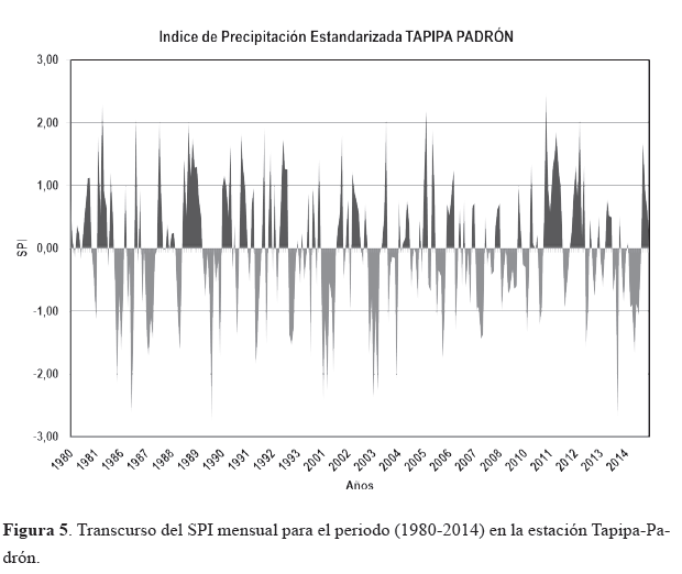 Los valores de intensidad de la sequía para la estación Tapipa-Padrón se presentan en la figura 5. De acuerdo a los registros de precipitación se presentaron valores de sequía extrema que constituyen el 3,18%, mientras que la intensidad severa representa el 4,14%. La intensidad que predomina es la moderada, la cual se presenta en un 7,01% del total de SPI mensual.