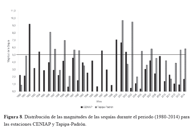 A título ilustrativo, la distribución de las magnitudes de las sequías en las estaciones CENIAP y Tapipa-Padrón se representan en la figura 8, siendo la estación de Tapipa-Padrón la que mayor número de magnitudes extremadamente fuertes (11 años) en comparación con la estación CENIAP cuyas magnitudes ubicadas en esta categoría están alrededor de 6 años. El evento de sequía ocurrido desde inicios del periodo pre-húmedo (abril) del 2001 a inicios (febrero y marzo) de 2002, constituye uno de los más intensos que se haya conocido en la mayoría del territorio nacional a lo largo del registro histórico.