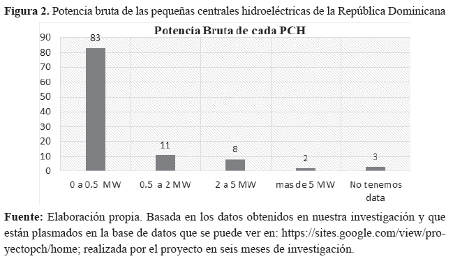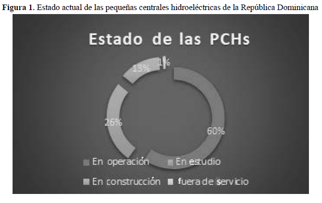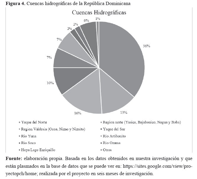 Si tomásemos las 10 regiones hidrográficas principales del país, podríamos ubicar las 107 pequeñas centrales hidroeléctricas (PCH) diseminadas por toda el área de la República Dominicana de la siguiente manera: En el río Yaque del Norte se encuentran 39 PCHs, para un 36%; en la región norte tenemos 13 PCHs entre los ríos Yásica, Bajabonico, Nagua y Boba, para un 13%; la región de Valdesia, con los ríos Ocoa, Nizao y Nizaíto poseen 17 PCHs, para un 16%; el río Yaque del Sur, con un 10%; el río Yuna con el 7%, con 8 PCHs; y el río Artibonito con 7 PCH, para un 7%; el río Soco y el río Ozama con 2 PCHs cada uno, para un 4%. El otro 7% corresponde a PCHs en la Sierra de Bahoruco, Dajabón y La Hoya del Lago Enriquillo (ver figura 4).