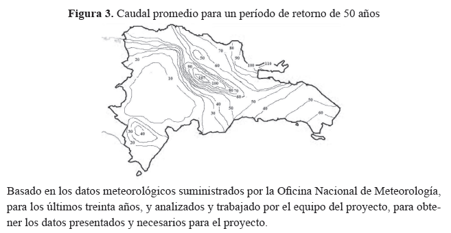 Con los datos suministrados por la ONAMET, se determinaron los caudales promedios, máximos y de estiaje que podía tener cada cuenca, con un período de retorno de 50 años (ver figura 3).