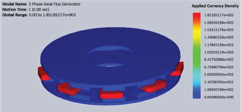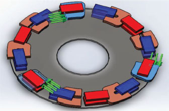 La forma propuesta del rotor para el generador de flujo axial trifásico se puede ver en la Fig. 1, y la distribución de los imanes de ferrita formaría un dodecágono regular.