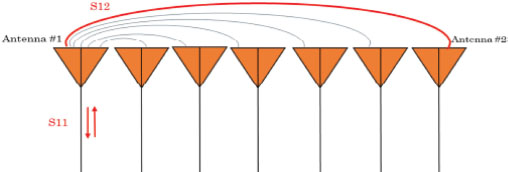 Mutual coupling is the electromagnetic interaction between the antenna elements in an array, as shown in Figure 1. The current developed in each antenna element of an array depends on their own excitation and on the contributions from adjacent antenna elements. Mutual coupling is inversely proportional to the spacing between the different antenna elements in an array. Mutual coupling in an array causes changes in the radiation pattern of the array and in the input impedance of the individual antenna elements in an array.