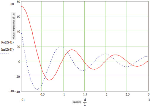 To characterize mutual coupling, can be used mutual impedance, S-parameters, a coupling matrix, or an embedded element pattern. Active impedance, or scan impedance, is the input impedance of each antenna element in an array, when all elements are excited. The active impedance of an array depends on the array configuration, the spacing between elements and the phase shift applied at each element. The effect of mutual coupling is observed or modeled by varying the space between the antenna elements in the array. Any change in the inter-element spacings changes the mutual impedance between the antenna elements. For example, the plot in Figure 2 shows the mutual impedance of a two-element dipole array as a function of inter-element spacing. It also shows that as the spacing between elements increases, the mutual impedance, and hence mutual coupling decreases. A coupling matrix is used to characterize the mutual coupling between the antenna elements at the port level. This matrix is calculated using S-parameters or Z-parameters and is used to decouple the array, depending on the number of ports in the array (MathWorks, 2023).