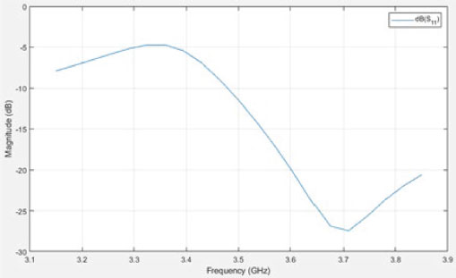 The antenna scattering parameter, also known as "Parameter S11," which is equivalent to the reflection coefficient for the antenna, is shown in Figure 3 corresponding to a value of -11 dB at a working frequency of 3.5 GHz. This value is equivalent to a return loss of 11 dB.