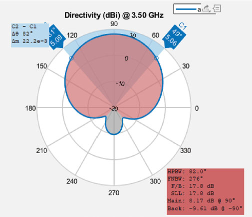 The characterization of the radiation pattern of the faces of both the 4-element and 6-element arrays was carried out to observe their behavior compared to the MATLAB simulations. For this purpose, the value of the half-power beamwidth (HPBW), which corresponds to the effective opening angle of the antenna, is determined. The simulated value of HPBW is equal to 82°, as shown in the Figure 6.