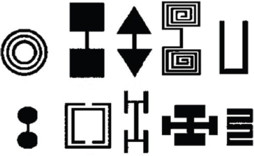 Defected ground structure (DGS) is a technique employed to create specific shapes, both symmetrical and asymmetrical, in the ground plane between antenna elements. These shapes are strategically designed to alter the propagation path of surface waves or modify the effective dielectric constant of the substrate, resulting in a frequency band elimination effect. DGS shares similarities with electromagnetic band gap (EBG) structures but offers the advantage of simpler manufacturing and requiring less surface area for implementation. Due to its band rejection capabilities and ease of integration, DGS has found widespread applications in various microwave circuits and antenna array designs. The diversity of DGS shapes and sizes is illustrated in Figure 9.