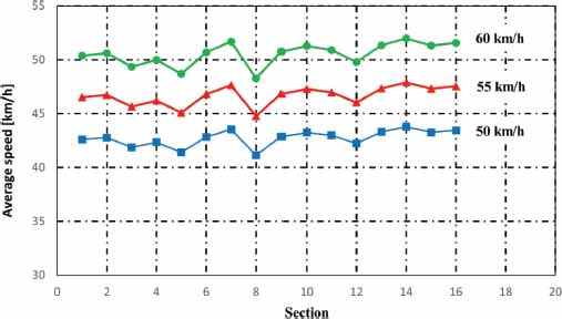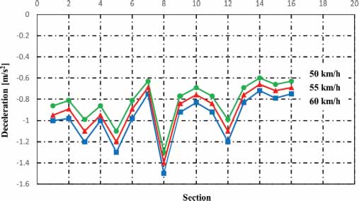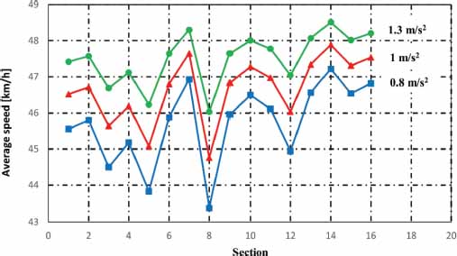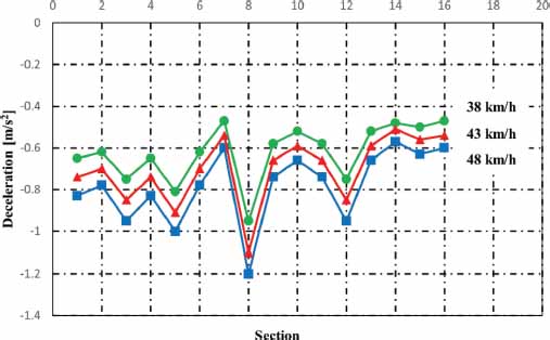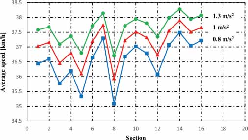 The results obtained consider a maximum acceleration ramp of 1.3 m/s2 and a maximum deceleration (in section 8, the shortest section of the entire route) of -1.5 m/s2. These maximum acceleration and deceleration values are within the typical ones reported in the technical literature, (Rios & García, 2010), for these cases of estimating energy demand.