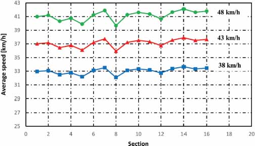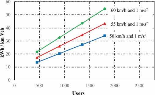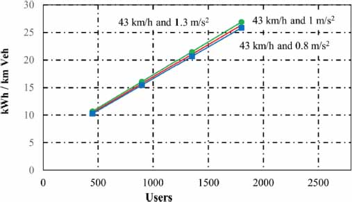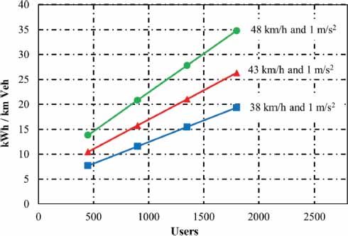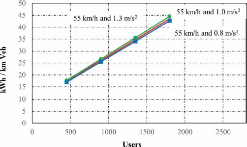 The scenario that comes closest to having a commercial speed of 43 km/h (the one specified for the system) is the one in which there is a cruising speed of 42.73 km/h and specific consumption of 13.54; 20.73; 27.23 and 34.07 kWh/km-veh for 450; 900; 1350 and 1800 passengers, respectively.