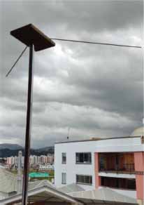 The design of the weather antenna was of the V-shaped arrangement of two half-wavelength dipoles for the VHF band; each element measures L/2 and they are separated by approximately 120°, to achieve a good reception of the modulated carrier signal. First, the working frequency of 138MHz was determined, which corresponds to the NOAA 18 satellite (height: 854 km, inclination 98.74°, period 102.12 minutes), which flies over the Colombian area. This design was made in the Matlab® "Antenna Designer" programming environment, specifically in the "Array Antenna Designer" to have two separate dipoles and generate the simulation of the omnidirectional radiation pattern and other antenna parameters; the circular polarization of the electric field, the bandwidth, the gain, the artificial ground plane, and the impedance matching with the transmission line were also considered. The dimension of the dipole L had the operating wavelength of 137 MHz as a reference. The effective length of the dipole is found using Eq. 1 while Fig. 4 shows the antenna built.