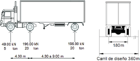 La especificación para carga viva empleada en la metodología de evaluación por capacidad es el camión estándar HS-MTOP, el cual se corresponde con las características del Ecuador. Debido a factores directamente relacionados al aumento y evolución del parque automotor, el Ministerio de Trasporte y Obras Públicas (MTOP) sugiere la utilización de un camión con un incremento aproximado del 37,8% del camión de diseño de la AASHTO. Este consiste en un camión tractor con semi-remolque de tres ejes, donde la separación de los ejes del tractor es 4.30 metros y la separación con el eje del remolque se considera variable, ya que este parámetro cambia según los camiones actuales, teniendo una separación mínima de 4.30 metros y una máxima de 9 metros. La carga en el eje delantero es igual a 49 kN y en cada eje trasero es igual a 196 kN. En la figura 3 se muestran las cargas asociadas al vehículo y la separación entre ellas.
