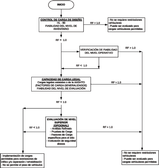 El método LRFR implementa un enfoque por los niveles de evaluación de la capacidad de carga como se describe en el Diagrama de Flujo en la Figura 4 (AASHTO MBE, 2020).