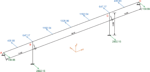 Para la subestructura se evaluaron los elementos de pila de sección circular (3 miembros) y los estribos abiertos de sección cuadrada (4 miembros), además se realizó el cálculo de sus elementos de apoyo tipo “L”. El MBE recomienda realizar el análisis en el sentido en el que se considere que la estabilidad de la estructura puede estar comprometida, por tanto, se consideró que para las pilas se evaluará únicamente en el sentido transversal al pórtico y para los estribos en sentido longitudinal al mismo. De igual manera, se consideran los valores afectados por agrietamiento en los elementos portantes. Para la consideración de las fuerzas sísmicas trasversales se tuvo en cuenta la importancia del puente, y por ende la necesidad de una investigación más completa, realizándose el análisis mediante el método elástico multimodal, el cual considera el aporte de los modos secundarios de vibración de un puente. Se consideró una estructura con 16 grados de libertad (GDL), condensándola a una matriz de rigidez K en los 7 GDL laterales, siendo los que interesan para el análisis de estabilidad. A partir de ahí se tuvo como resultado las fuerzas sísmicas para pilas y estribos tal como se observan en la Figura 6. En la misma las fuerzas están en kN y las distancias en metros.